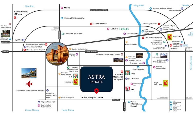 Astra Infinite(アストラ インフィニット)から、メーカー運河までは約230m、セントラル チェンマイ メモリアル病院までは約400m、チェンマイ母子病院までは約450m、チェンマイ旧市街までは約1km、タイ国鉄チェンマイ駅までは約3.1km、チェンマイ国際空港までは約4.1kmの距離です。また、周辺にはアヌサーン市場、セブンイレブン、マクドナルド、ビッグC、KFC、ウアラーイ歩行者天国、ターペー門、チェンマイナイトバザール、レストランなどがあります。