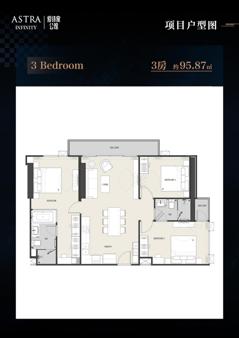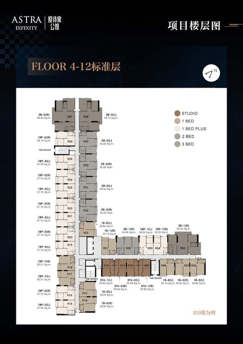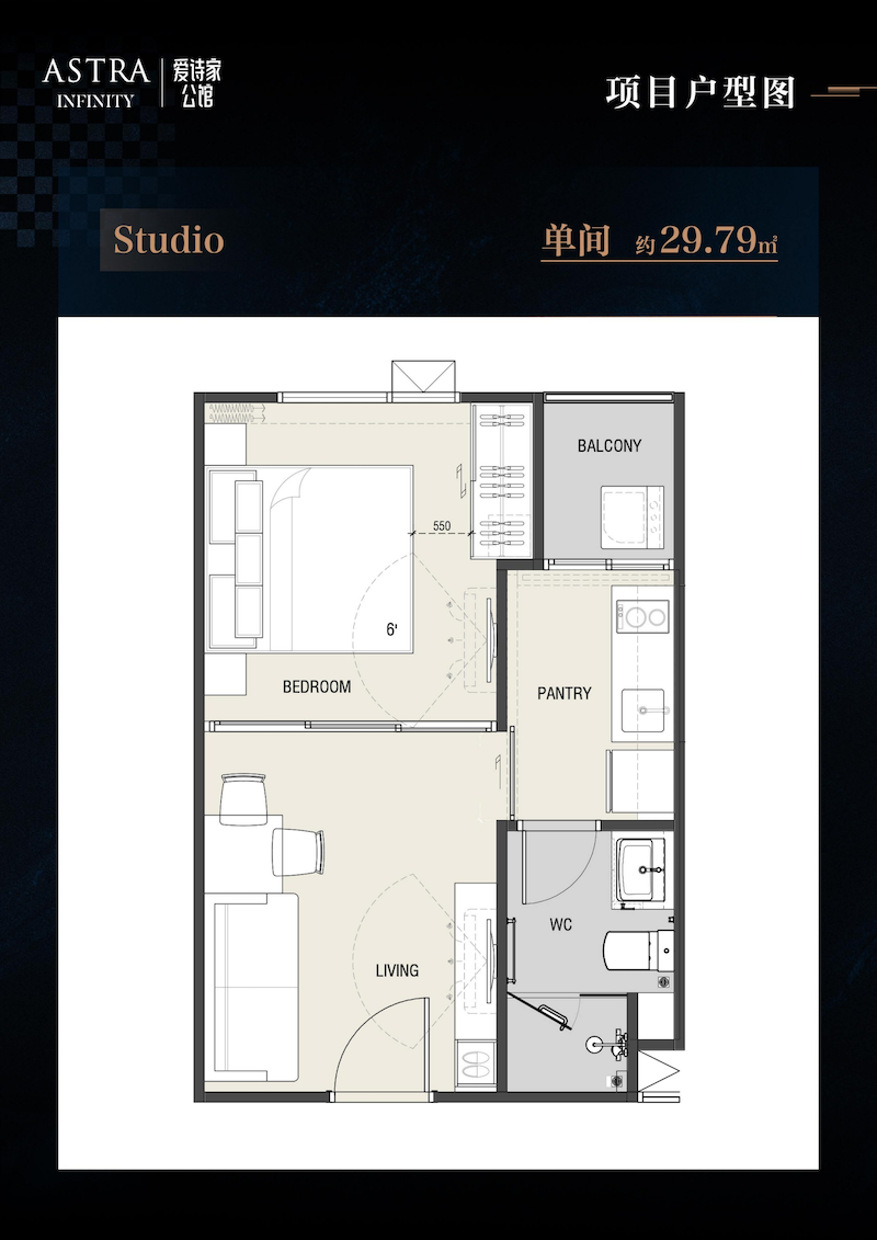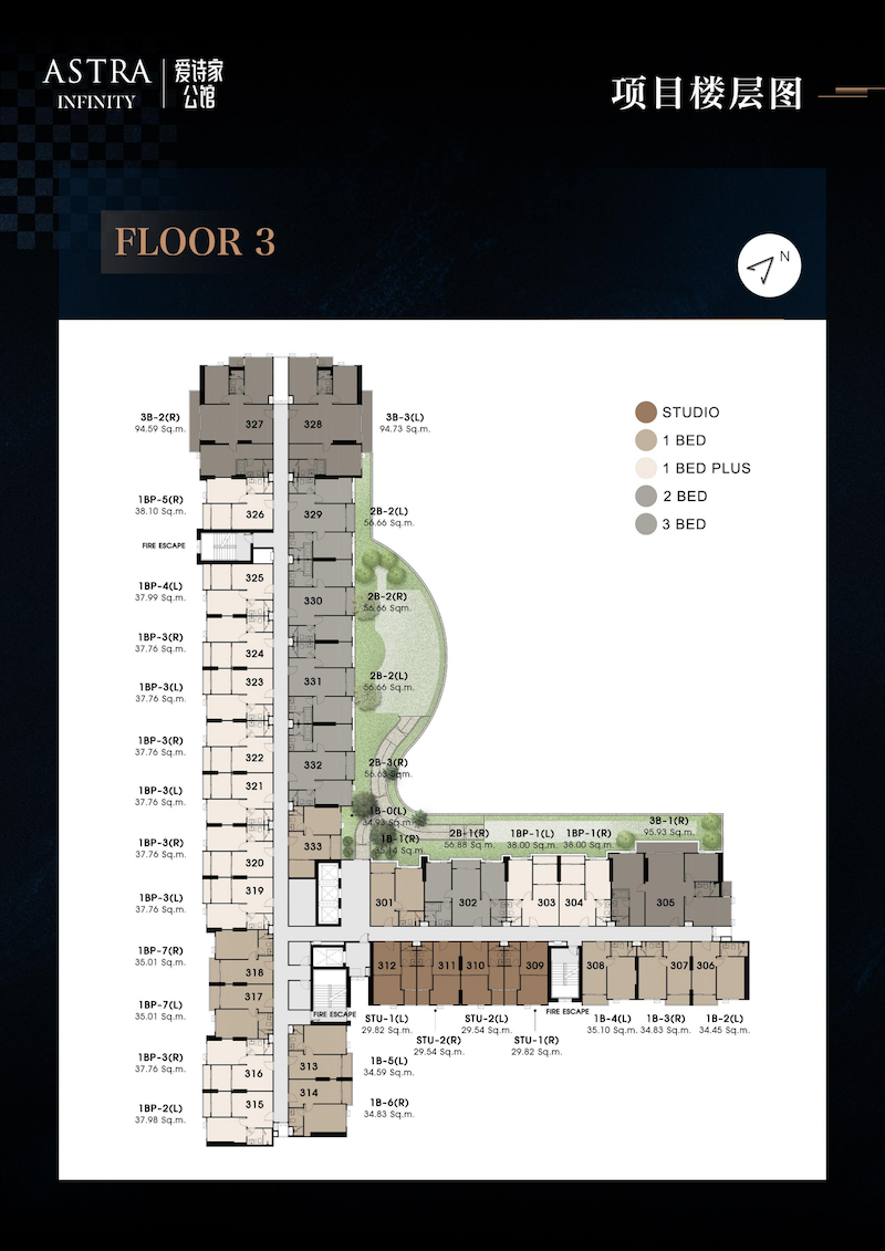 お部屋の広さは29.54㎡〜95.93㎡、間取りはスタジオ〜3ベッドルームまでの5タイプがあります。