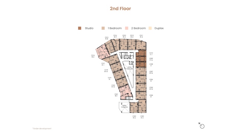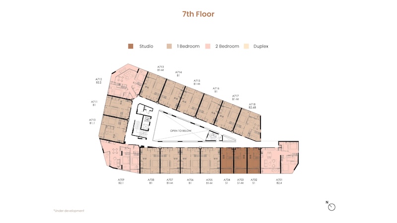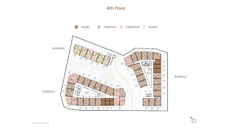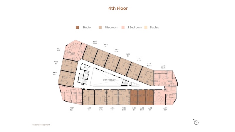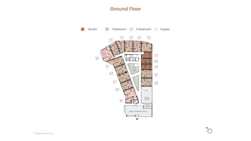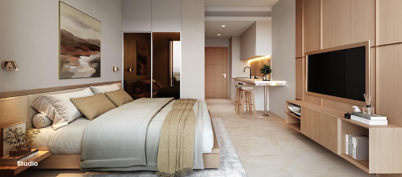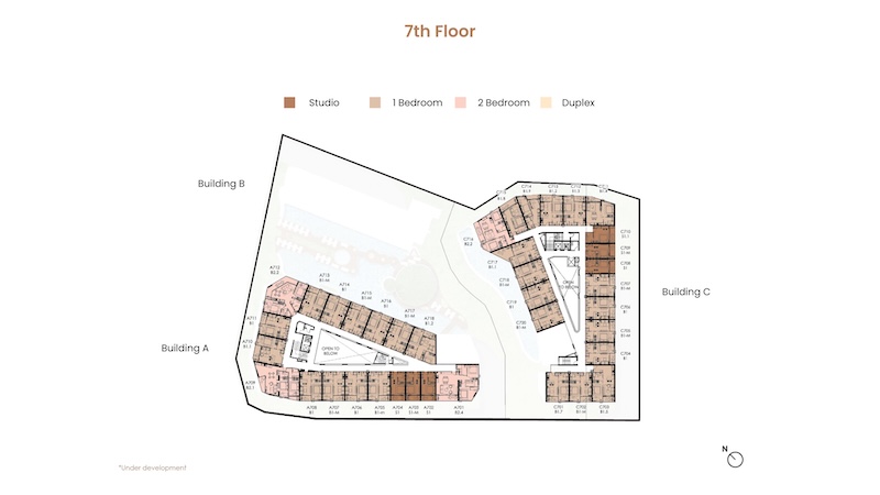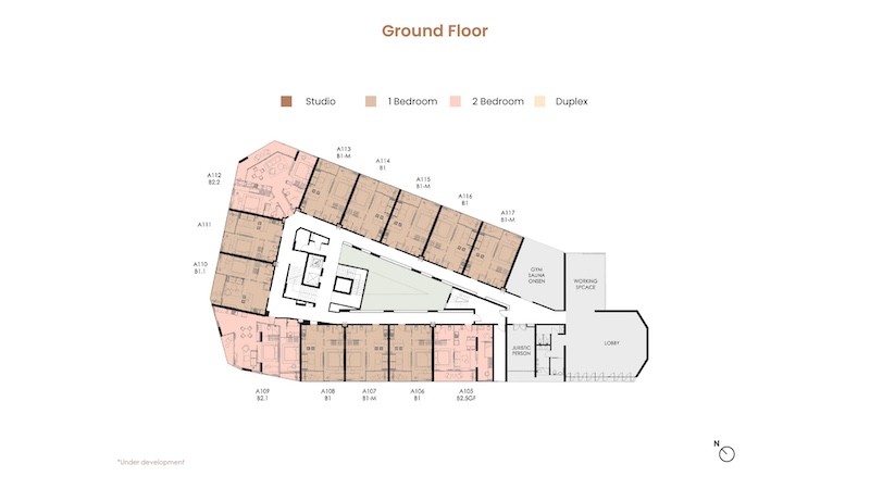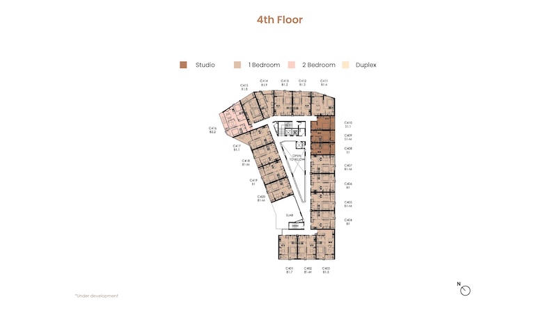 お部屋の広さは30㎡〜104.25㎡、間取りはスタジオ〜デュプレックスまでの4タイプがあります。