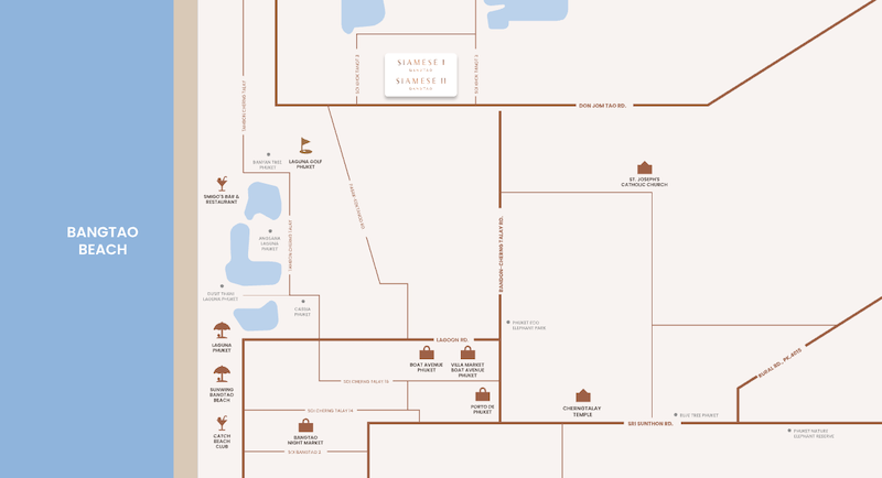 Siamese Bangtao(サイアミーズ バンタオ)から、タラーンホスピタルまでは約4.2km、バンタオビーチまでは約5.6km、バンコクホスピタルクリニックまでは約5.8km、プーケット国際空港までは約11.9kmの距離にあります。また、周辺にはラグーナゴルフプーケット、シリナート国立公園、ホームプロ、テスコロータス、マクロ、トップスデイリー、セブンイレブン、ポルト デ プーケット、ヴィラマーケット、ボートアベニュー、トップスフードホール、トップスワインセラー、プライムバーガー、バーガーキング、PTTガソリンスタンド、ロータスゴーフレッシュ、レストランなどの施設があります。