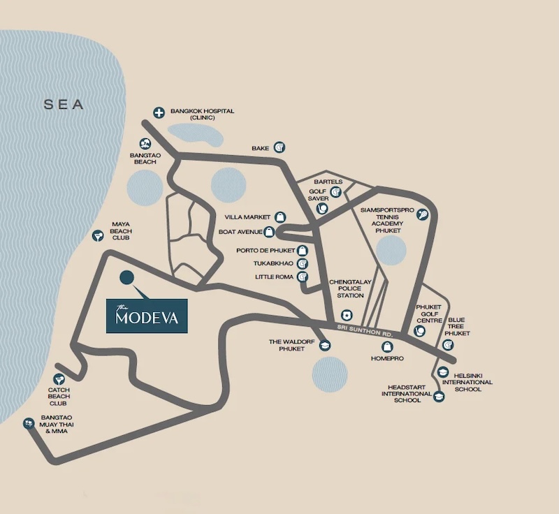 ザ モデヴァ(The Modeva)から、バンタオビーチまでは約1.2km、バンコクホスピタルクリニックまでは約2.7km、スリンビーチまでは約4.0km、プーケット国際空港までは約16.7kmの距離にあります。また、周辺にはポルト デ プーケット、ホームプロ、バンタオナイトマーケット、ヴィラマーケット、プライムバーガー、バーガーキング、トップスフードホール、ボートアベニュー、ラグーナゴルフ プーケット、セブンイレブン、レストランなどの施設があります。